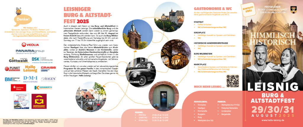 Alle Programminfos für das Leisniger Burg- und Altstadtfest 2025 sind hier ab sofort zu finden. Einfach den digitalen Flyer (PDF) downloaden und gerne auch teilen 🙂